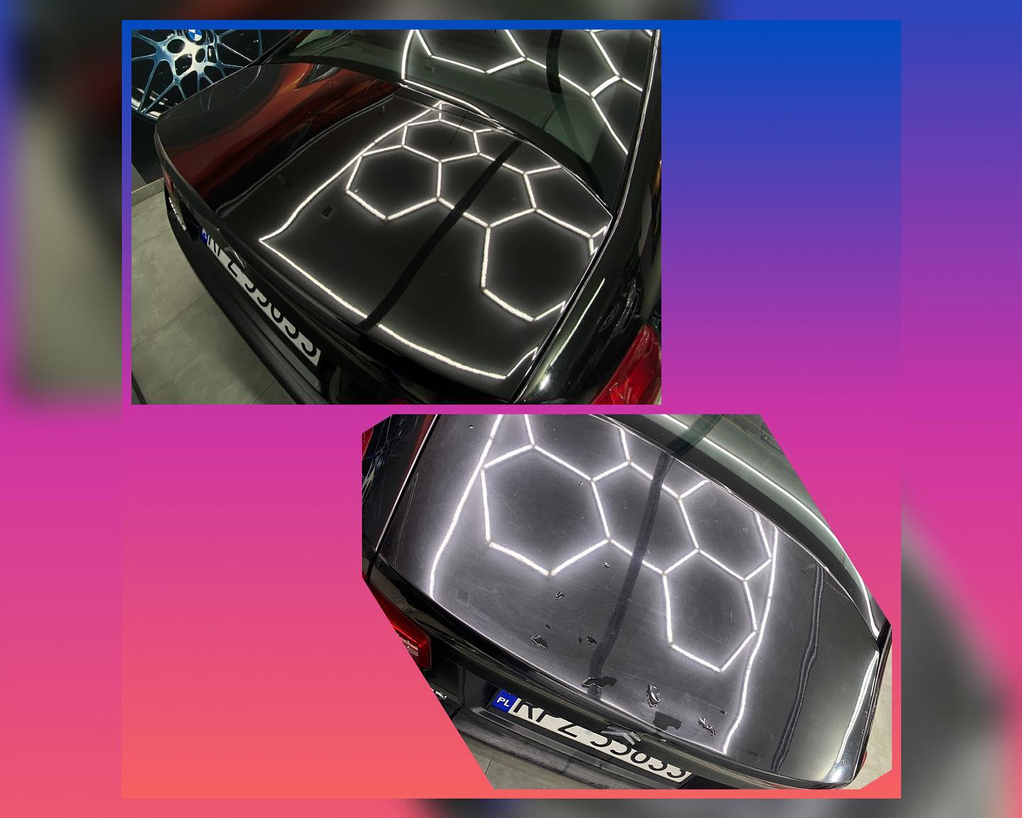 Na początku wykonaliśmy dokładne mycie dwuetapowe aby zmyć brud, odtluscilismy cały samochód i przeszliśmy do polerowania element po elemencie, następnie nałożyliśmy wosk, dzięki czemu samochód będzie można umyć z łatwością a pył i nieczystości z dróg nie będą się tak łatwo utwierdzać na lakierze!